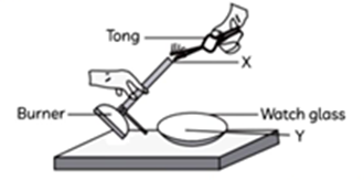 10. A 2 cm long thin ribbon of a metal ‘ $X$ ‘ was taken and first cleaned with a sandpaper. It was then burnt using a spirit lamp or a burner by holding it with a pair of tongs. The ribbon burnt with a dazzling white flame and formed a powder ‘ $\gamma$ ‘ which was collected in a watch glass.