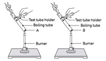 11. Amit took two boiling tubes. He added about 2 grams of a green coloured metal salt ‘A’ in the first tube and 2 grams of a white coloured metal salt ‘ $B$ ‘ in the second tube. Both the tubes were heated by holding them with a pair of tongs. The smell of burning sulphur was observed in first test tube, whereas brown gas was emitted in the second test tube.